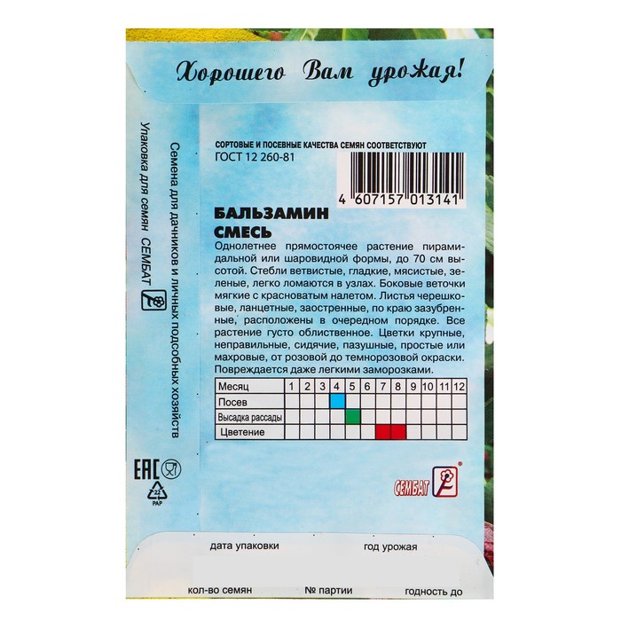 Производитель: Сембат; Габариты: 7,5 x 11,5 x 0,1; Страна: Россия; В боксе: 100 шт; Состав: Семена; Материалы: семена; Фасовка: по 10 шт; Индивидуальная упаковка: Без упаковки; Сертификат: Не подлежит сертификации; Цвет: Розовый; Высота, см: 70; Агрономический срок годности, лет: 3; Вегетация: Однолетники; Вид: Бальзамин; Цветение период: Август, Сентябрь; Упаковка: Цветная; Особенности выращивания: Открытый грунт; Подходит для балкона: Нет; Сухоцвет: Нет; Махровые: Нет; По форме куста: Кустовая, Ампельная; Назначение: Для создания цветников, клумбы; Отношение к свету: Рассеянный свет; Разновидность: Цветущее; Нуждаются ли в стратификации: Нет