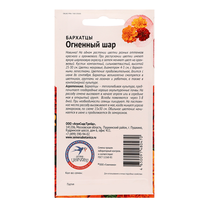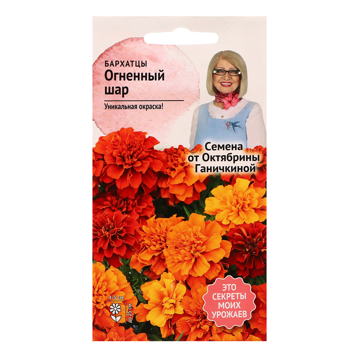 Новинка! На одном растении цветки разных оттенков красного и оранжевого. При распускании цветки имеют яркую шарлаховую окраску, а затем меняют цвет на оранжевый. Кустик компактный, сильноветвистый, высотой 25-30 см. Цветки махровые, диаметром 4-5 см, с бархатными лепестками. Цветение продолжительное, длится с июня до сентября. Бархатцы великолепно смотрятся в цветниках, группами на газонах и рабатках, а также в контейнерной культуре. Агротехника: Бархатцы – теплолюбивая культура, предпочитает плодородные хорошо окультуренные почвы. На рассаду семена высевают в начале апреля или в середине мая в открытый грунт. Всходы появляются через 5-8 дней. При необходимости сеянцы пикируют. На постоянное место рассаду высаживают в мае, когда минует угроза заморозков, по схеме 15х30 см. Обильное цветение начинается в июне и продолжается до заморозков. Штрих-код -