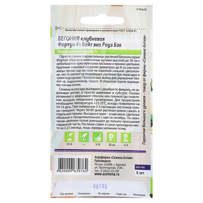 Производитель: Семена Алтая; Габариты: 0,4 x 8 x 15; Страна: Россия; В боксе: 300 шт; Состав: См. на упаковке; Материалы: см. на упаковке; Фасовка: по 10 шт; Индивидуальная упаковка: Без упаковки; Сертификат: Не подлежит сертификации; Цвет: Белый; Высота, см: 30; Вегетация: Многолетники; Вид: Бегония; Тип: Комнатные; Цветение период: Сентябрь, Май, Август, Июнь, Июль, Апрель; Упаковка: Цветная; Место выращивания: Закрытый грунт (теплицы, укрытия); Подходит для балкона: Да; Махровые: Да; Высота растений: До 30 см; По форме куста: Кустовая; Отношение к свету: Рассеянный свет Бегония – одно из самых красивых растений, чей великолепный вид привлечёт взгляд любого человека, даже самого далекого от цветоводства. Большие 8-9 см, супермахровые цветки с волнистыми лепестками бело-розового цвета. Побеги мясистые 25-35 см. Цветение обильное и продолжительное, с мая по октябрь. Легко размножаются семенами. Предпочитают почвы со слегка кислой реакцией. Хорошо отзывается на подкормку. Посев производят в конце декабря - начале марта. Семена высевают, не заделывая. Посевы содержат под стеклом и до первой пикировки равномерно увлажняют теплой водой. Пикируют в стадии 2 – 3 настоящих листочков. После цветения, полив уменьшают, до полного подсыхания надземной части, которую удаляют. Растения ставят в сухое прохладное место на 2-2,5 мес., лишь изредка увлажняя почву. Бегония отлично подходит для украшения балконов, подоконников, а так же для посадки в открытый грунт. Летом прекрасно смотрится в садах, скверах и парках.