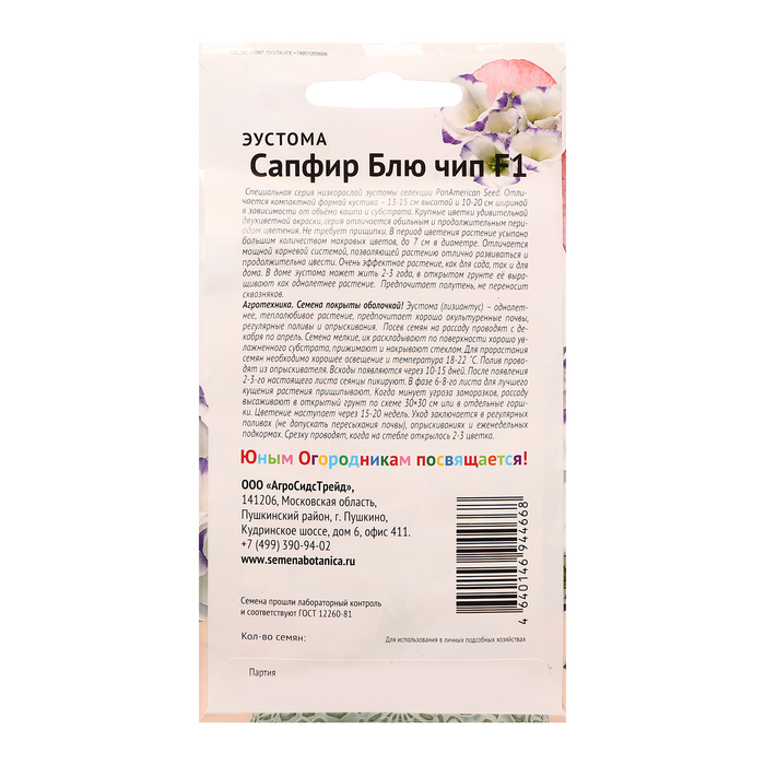 Специальная серия низкорослой эустомы селекции PanAmerican Seed. Отличается компактной формой кустика – 13-15см высотой и 10-20см шириной в зависимости от объёма кашпо и субстрата. Крупные цветки удивительной двухцветной окраски, серия отличается обильным и продолжительным периодом цветения. Не требует прищипки. В период цветения растение усыпано большим количеством махровых цветов, до 7см в диаметре. Отличается мощной корневой системой, позволяющей растению отлично развиваться и продолжительно цвести. Очень эффектное растение, как для сада, так и для дома. В доме эустома может жить 2-3 года, в открытом грунте её выращивают как однолетнее растение. Предпочитает полутень, не переносит сквозняков. Агротехника: Семена покрыты оболочкой! Эустома (лизиантус) – однолетнее, теплолюбивое растение, предпочитает хорошо окультуренные почвы, регулярные поливы и опрыскивания. Посев семян на рассаду проводят с декабря по апрель. Семена мелкие, их раскладывают по поверхности хорошо увлажненного субстрата, прижимают и накрывают стеклом. Для прорастания семян необходимо хорошее освещение и температура 18-22˚С. Полив проводят из опрыскивателя. Всходы появляются через 10-15 дней. После появления 2-3-го настоящего листа сеянцы пикируют. В фазе 6-8 листа для лучшего кущения растения прищипывают. Когда минует угроза заморозков, рассаду высаживают в открытый грунт по схеме 30×30 см или в отдельные горшки. Цветение наступает через 15-20 недель. Уход заключается в регулярных поливах (не допускать пересыхания почвы), опрыскиваниях и еженедельных подкормах. Срезку проводят, когда на стебле открылось 2-3 цветка. Штрихкод -