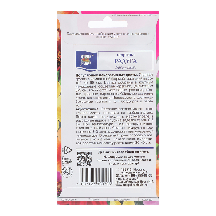 Производитель: УРОЖАЙ УДАЧИ; Габариты: 15 x 8 x 0,2; Страна: Россия; В боксе: 300 шт; Состав: См. на упаковке; Материалы: см. на упаковке; Фасовка: по 2 шт; Индивидуальная упаковка: Без упаковки; Сертификат: Не подлежит сертификации; Цвет: МИКС; Агрономический срок годности, лет: 3; Вегетация: Однолетники; Вид: Георгина; Темпер. ограничение НЕ НИЖЕ ℃: 0; Особенности выращивания: Открытый грунт; Сезон доставки: Весна; Вид упаковки: Пакет; Корневая система: ЗКС (закрытая корневая система); Сухоцвет: Да; Махровые: Да; По форме куста: Кустовая; Назначение: Для создания цветников, клумбы; Отношение к свету: Рассеянный свет; Разновидность: Цветущее; Нуждаются ли в стратификации: Нет