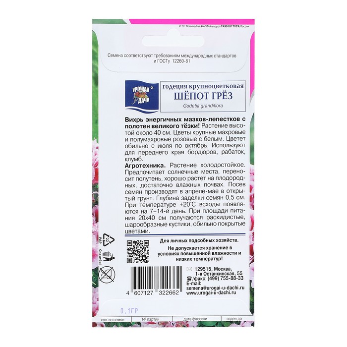 Производитель: УРОЖАЙ УДАЧИ; Габариты: 15 x 8 x 0,1; Страна: Россия; В боксе: 450 шт; Состав: См. на упаковке; Материалы: см. на упаковке; Фасовка: по 1 шт; Индивидуальная упаковка: Без упаковки; Сертификат: Не подлежит сертификации; Цвет: Розовый; Агрономический срок годности, лет: 4; Вегетация: Однолетники; Вид: Годеция; Особенности выращивания: Открытый грунт; Сухоцвет: Нет; Махровые: Нет; По форме куста: Кустовая; Назначение: Для создания цветников, клумбы; Отношение к свету: Светолюбивые; Разновидность: Цветущее; Нуждаются ли в стратификации: Нет
