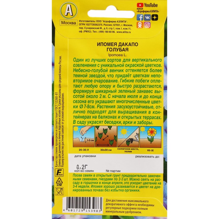 Производитель: Агрофирма АЭЛИТА; Габариты: 15 x 8 x 0,1; Страна: Россия; В боксе: 600 шт; Состав: Семена; Материалы: семена; Фасовка: по 10 шт; Индивидуальная упаковка: Без упаковки; Сертификат: Не подлежит сертификации; Цвет: Голубой; Агрономический срок годности, лет: 5; Вегетация: Однолетники; Вид: Ипомея; Особенности выращивания: Открытый грунт; Сухоцвет: Нет; Махровые: Нет; По форме куста: Кустовая; Назначение: Для создания цветников, клумбы; Отношение к свету: Светолюбивые; Разновидность: Цветущее; Нуждаются ли в стратификации: Нет