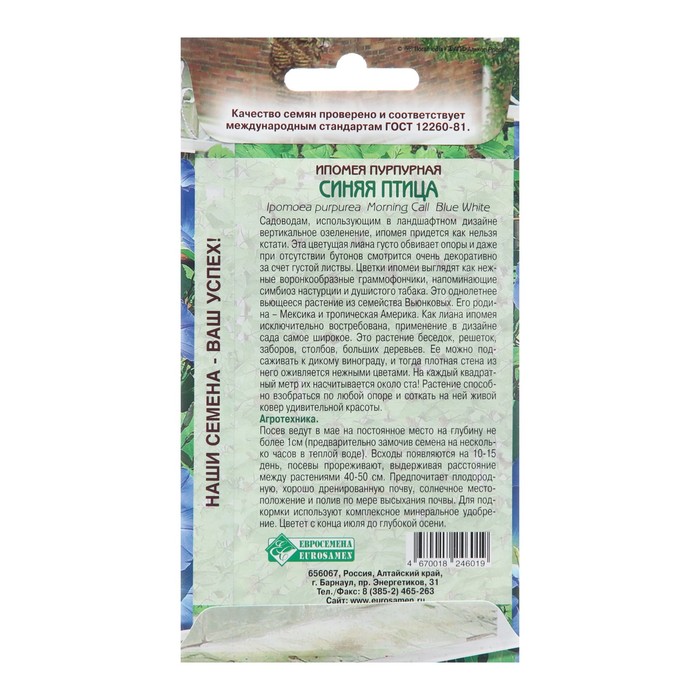 Производитель: Евросемена; Габариты: 15 x 8 x 0,2; Страна: Россия; В боксе: 400 шт; Состав: См. на упаковке; Материалы: см. на упаковке; Фасовка: по 1 шт; Индивидуальная упаковка: Без упаковки; Сертификат: Не подлежит сертификации; Цвет: Синий; Агрономический срок годности, лет: 5; Вегетация: Однолетники; Вид: Ипомея; Особенности выращивания: Открытый грунт; Сухоцвет: Нет; Махровые: Нет; По форме куста: Кустовая; Назначение: Для создания цветников, клумбы; Отношение к свету: Светолюбивые; Разновидность: Цветущее; Нуждаются ли в стратификации: Нет