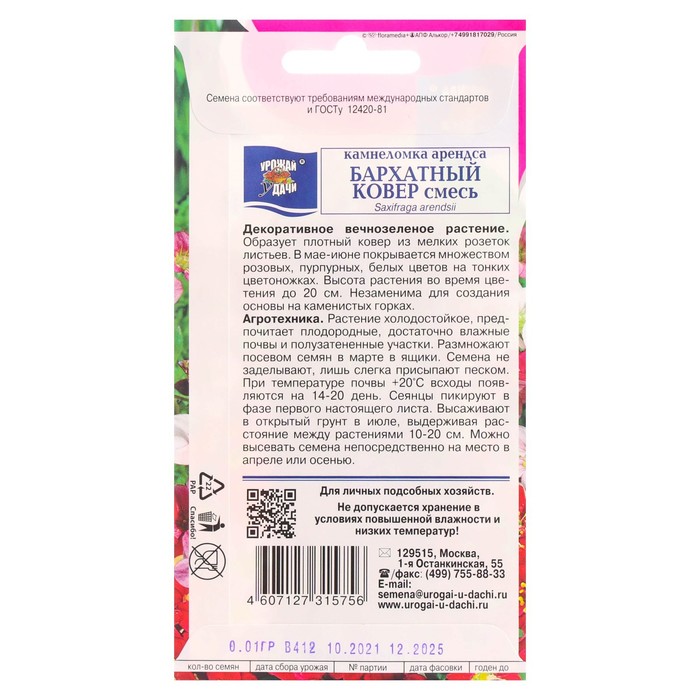 Производитель: УРОЖАЙ УДАЧИ; Габариты: 15 x 8 x 0,2; Страна: Россия; В боксе: 600 шт; Состав: См. на упаковке; Материалы: см. на упаковке; Фасовка: по 10 шт; Индивидуальная упаковка: Без упаковки; Сертификат: Не подлежит сертификации; Цвет: МИКС; Агрономический срок годности, лет: 5; Вегетация: Многолетники; Вид: Камнеломка; Особенности выращивания: Открытый грунт; Сухоцвет: Нет; Махровые: Нет; По форме куста: Кустовая; Назначение: Для создания цветников, клумбы; Отношение к свету: Теневыносливые; Разновидность: Цветущее; Нуждаются ли в стратификации: Нет Декоративное вечнозеленое растение. Образует плотный ковер из мелких розеток листьев. В мае-июне покрывается множеством розовых, пурпурных, белых цветов на тонких цветоножках. Высота растения во время цветения до 20 см. Незаменима для создания основы на каменистых горках. Растение холодостойкое, предпочитает плодородные, достаточно влажные почвы и полузатененные участки. Размножают посевом семян в марте в ящики. Семена не заделывают, лишь слегка присыпают песком. При температуре почвы +20 °С всходы появляются на 14-20 день. Сеянцы пикируют в фазе первого настоящего листа. Высаживают в открытый грунт в июле, выдерживая расстояние между растениями 10-20 см. Можно высевать семена непосредственно на место в апреле или осенью.