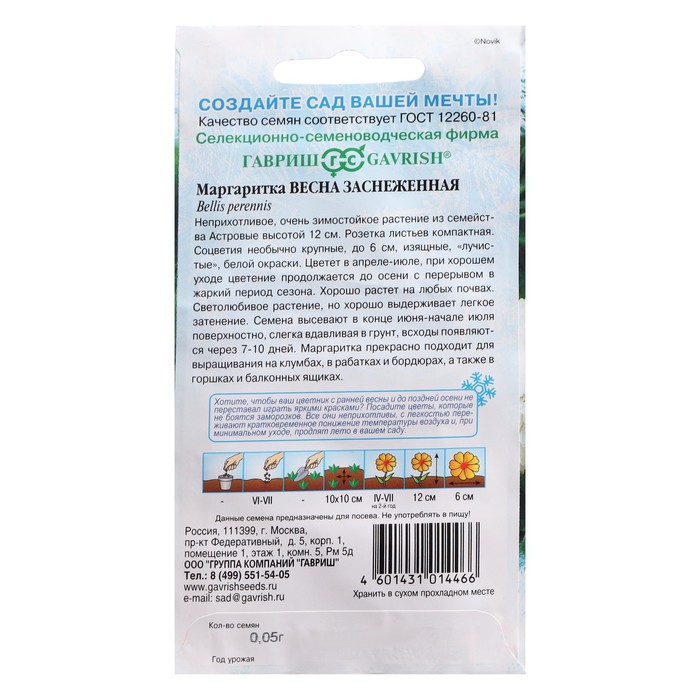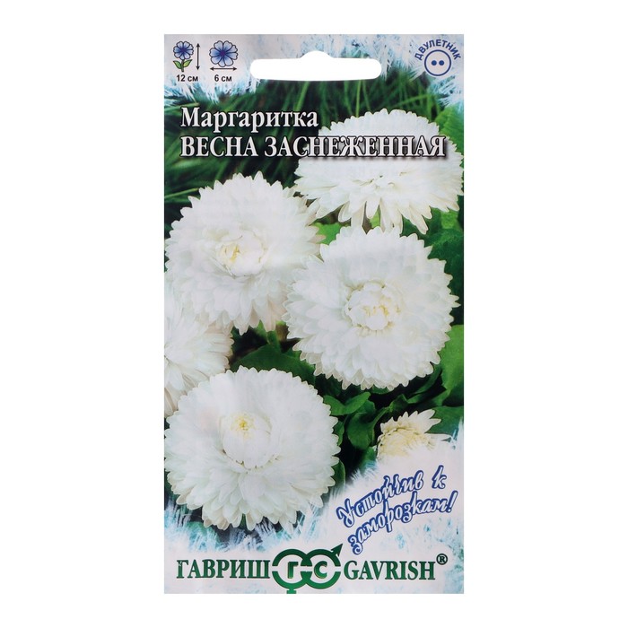 Производитель: Гавриш; Габариты: 15 x 8 x 0,2; Страна: Россия; В боксе: 200 шт; Состав: Семена; Материалы: семена; Фасовка: по 10 шт; Индивидуальная упаковка: Без упаковки; Сертификат: Не подлежит сертификации; Цвет: Белый; Агрономический срок годности, лет: 5; Вегетация: Многолетники; Вид: Маргаритка; Особенности выращивания: Открытый грунт; Сухоцвет: Да; Махровые: Да; По форме куста: Кустовая; Назначение: Для создания цветников, клумбы; Отношение к свету: Рассеянный свет; Разновидность: Цветущее; Нуждаются ли в стратификации: Нет