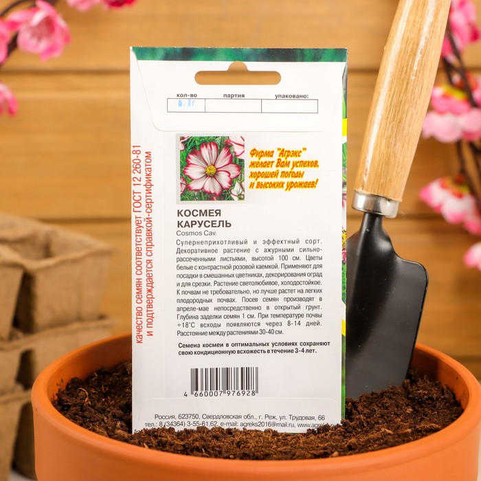 Производитель: АГРЭКС; Габариты: 15 x 8 x 0,2; Страна: Россия; В боксе: 500 шт; Состав: См. на упаковке; Материалы: см. на упаковке; Фасовка: по 10 шт; Индивидуальная упаковка: Без упаковки; Сертификат: Не подлежит сертификации; Цвет: Разноцветный; Агрономический срок годности, лет: 3; Вегетация: Однолетники; Вид: Космея; Особенности выращивания: Открытый грунт; Сухоцвет: Нет; Махровые: Нет; По форме куста: Кустовая; Назначение: Для создания цветников, клумбы; Отношение к свету: Светолюбивые; Разновидность: Цветущее; Нуждаются ли в стратификации: Нет