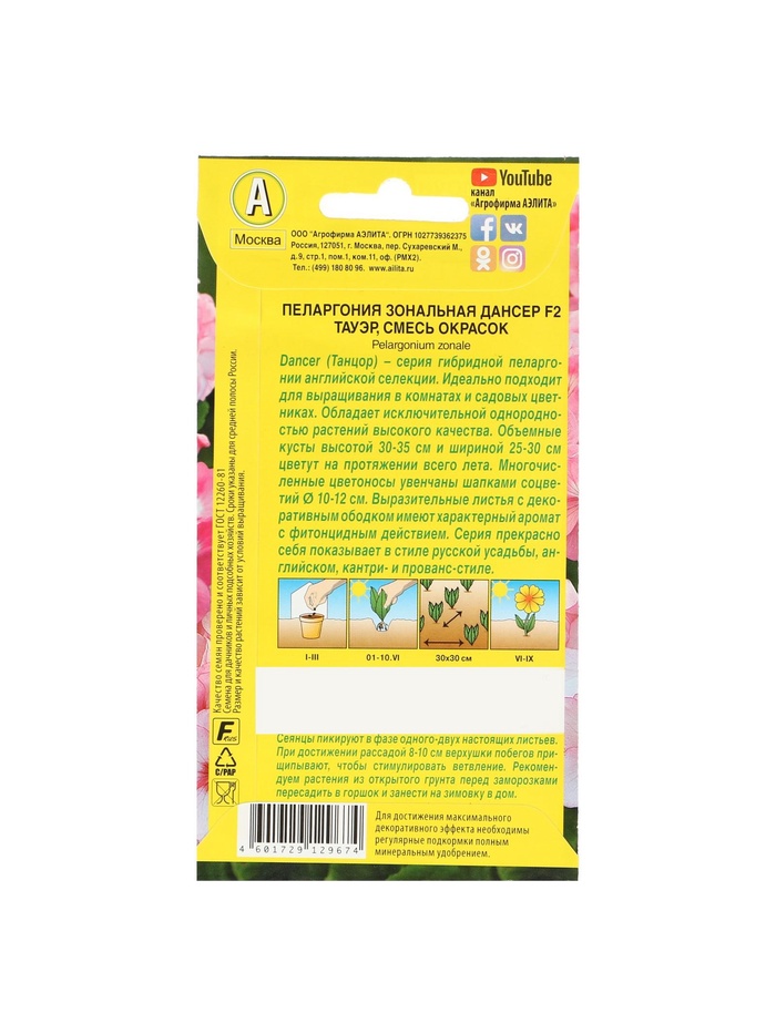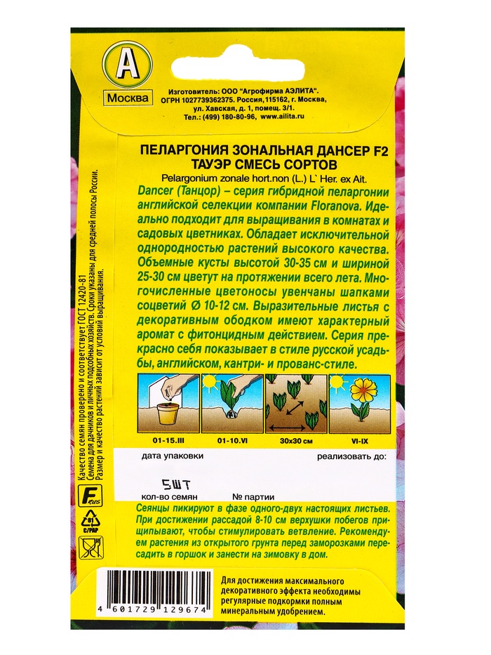 Производитель: Агрофирма АЭЛИТА; Габариты: 15 x 8 x 0,2; Страна: Индия; В боксе: 100 шт; Состав: См. на упаковке; Материалы: см. на упаковке; Фасовка: по 10 шт; Индивидуальная упаковка: Без упаковки; Сертификат: Не подлежит сертификации; Цвет: МИКС, Розовый; Высота, см: 40; Агрономический срок годности, лет: 3, 5; Вегетация: Однолетники, Многолетники; Вид: Пеларгония; Посев на рассаду: Февраль, Декабрь, Январь, Март, Ноябрь; Посев в грунт: Март, Июнь, Апрель, Июль, Май; Цветение период: Апрель, Май, Июнь, Июль; Особенности выращивания: Открытый грунт, Комнатное выращивание, Подоконник, балкон; Подходит для балкона: Нет; Сухоцвет: Нет; Махровые: Нет; По форме куста: Кустовая; Назначение: Для создания цветников, клумбы; Отношение к свету: Рассеянный свет; Разновидность: Цветущее; Вид: Семечки; Нуждаются ли в стратификации: Нет