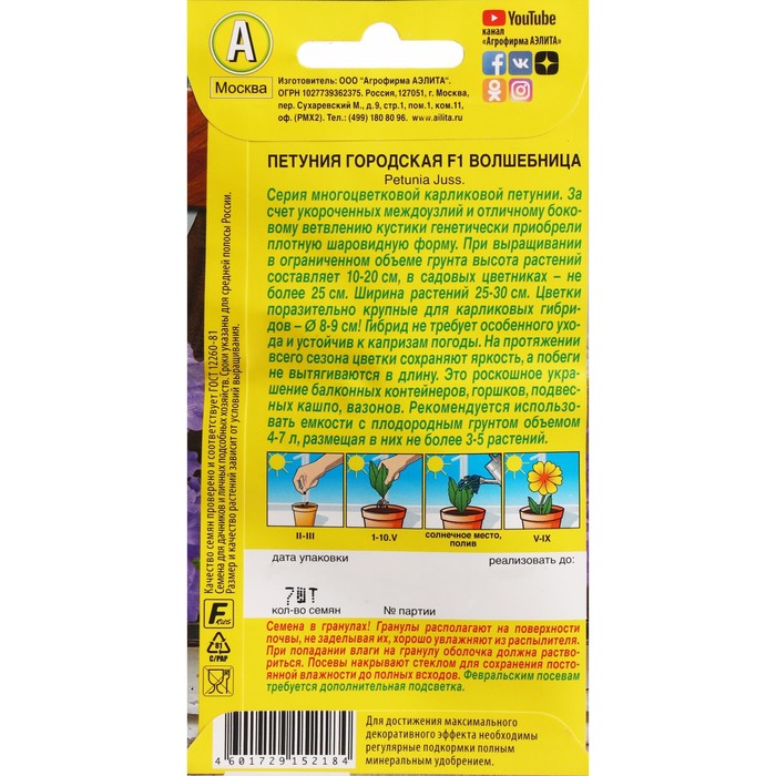 Производитель: Агрофирма АЭЛИТА; Габариты: 15 x 8 x 0,5; Страна: Нидерланды; В боксе: 500 шт; Состав: Семена; Материалы: семена; Фасовка: по 10 шт; Индивидуальная упаковка: Без упаковки; Сертификат: Не подлежит сертификации; Цвет: Белый, Фиолетовый; Высота, см: 10; Агрономический срок годности, лет: 5; Вегетация: Однолетники; Вид: Петуния; Особенности выращивания: Универсальный, Открытый грунт; Сухоцвет: Нет; Махровые: Нет; По форме куста: Кустовая; Назначение: Для создания цветников, клумбы, Для балкона, веранды; Отношение к свету: Светолюбивые; Разновидность: Цветущее; Нуждаются ли в стратификации: Нет