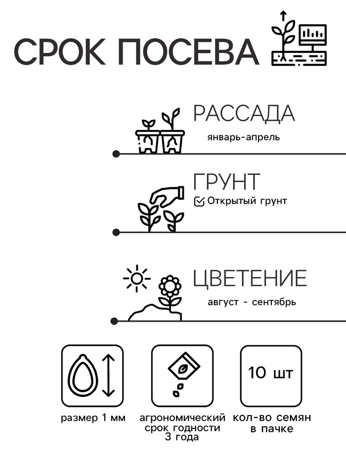 Цветет обильно до глубоких заморозков. Семена сеют поверхностно, без заделки, под стекло или пленку для сохранения постоянной влажности. Пока посевы маленькие их рекомендуется опрыскивать из распылителя, а не поливать. Посев на рассаду с января по апрель.