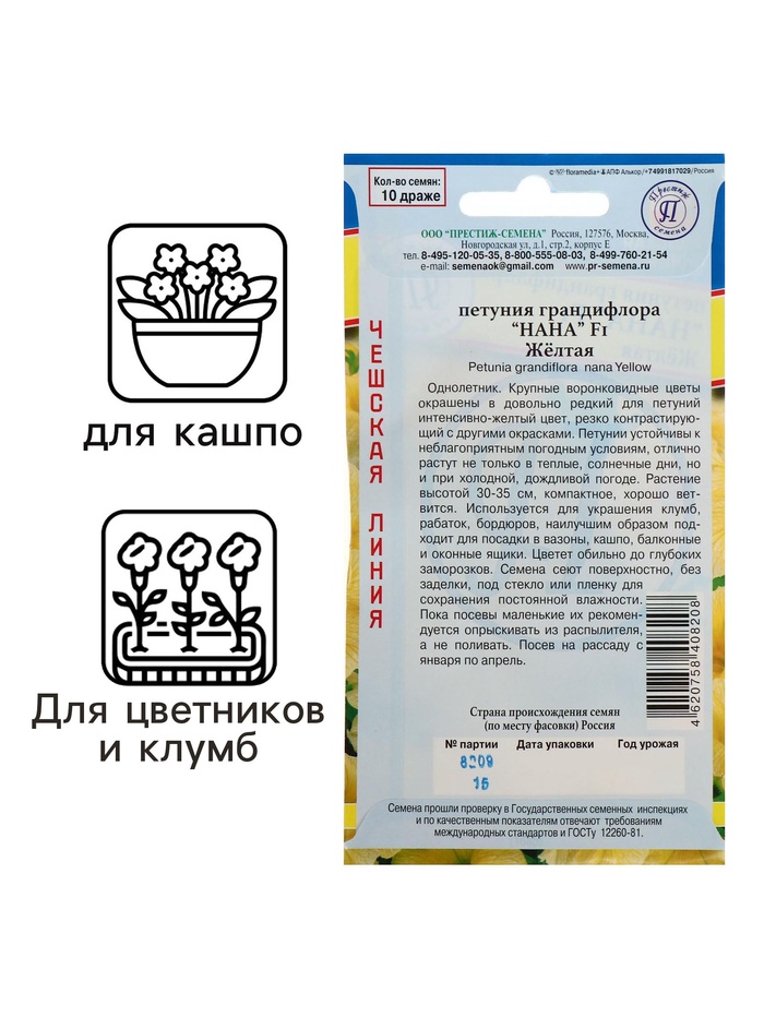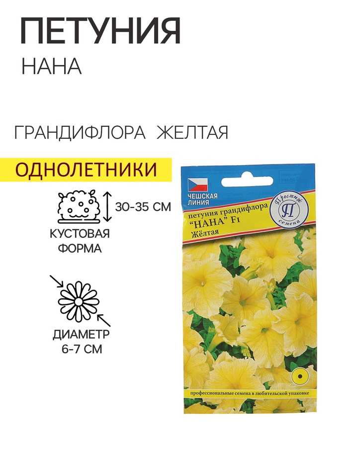 Производитель: Престиж семена; Габариты: 15 x 8 x 0,2; Страна: Россия; В боксе: 700 шт; Состав: Семена; Материалы: семена; Фасовка: по 10 шт; Индивидуальная упаковка: Без упаковки; Сертификат: Не подлежит сертификации; Цвет: Жёлтый; Высота, см: 40 - 45; Вегетация: Однолетники; Вид: Петуния; Посев на рассаду: Март, Январь, Февраль, Апрель; Цветение период: Сентябрь, Июль, Июнь, Август; Упаковка: Цветная; Место выращивания: Открытый грунт; Сорт: F1; Сухоцвет: Да; Махровые: Нет; Высота растений: 30-60 см; По форме куста: Кустовая; Назначение: Для создания цветников, клумбы; Отношение к свету: Светолюбивые; Разновидность: Цветущее; Нуждаются ли в стратификации: Нет