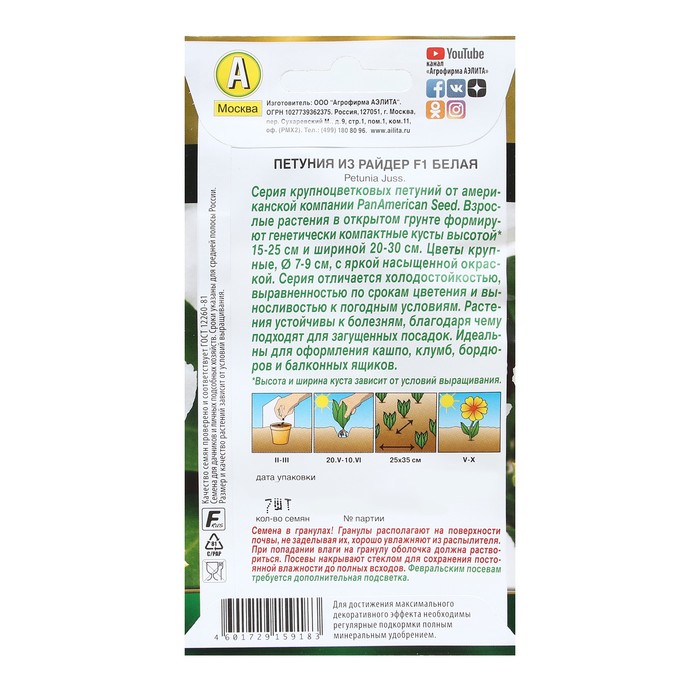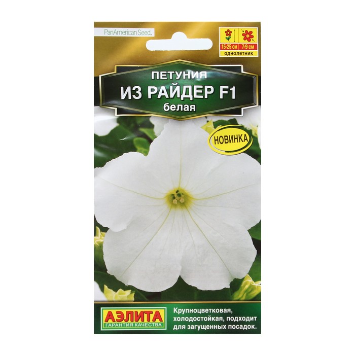 Производитель: Агрофирма АЭЛИТА; Габариты: 15 x 8 x 0,5; Страна: Россия; В боксе: 200 шт; Состав: См. на упаковке; Материалы: см. на упаковке; Фасовка: по 1 шт; Сертификат: Не подлежит сертификации; Цвет: Белый; Агрономический срок годности, лет: 2; Вегетация: Однолетники; Вид: Петуния; Особенности выращивания: Открытый грунт; Сухоцвет: Нет; Махровые: Нет; По форме куста: Кустовая; Назначение: Для балкона, веранды, Для создания цветников, клумбы Серия крупноцветковых петуний от американской компании PanAmerican Seed. Взрослые растения в открытом грунте формируют генетически компактные кусты высотой* 15-25 см и шириной 20-30 см. Цветы крупные, Ø 7-9 см, с яркой насыщенной окраской. Серия отличается холодостойкостью, выравненностью по срокам цветения и выносливостью к погодным условиям. Растения устойчивы к болезням, благодаря чему подходят для загущенных посадок. Идеальны для оформления кашпо, клумб, бордюров и балконных ящиков. *Высота и ширина куста зависит от условий выращивания.