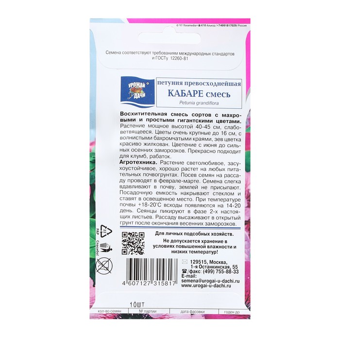 Производитель: УРОЖАЙ УДАЧИ; Габариты: 15 x 8 x 0,2; Страна: Россия; В боксе: 150 шт; Состав: См. на упаковке; Материалы: см. на упаковке; Фасовка: по 9 шт; Индивидуальная упаковка: Без упаковки; Сертификат: Не подлежит сертификации; Цвет: МИКС; Агрономический срок годности, лет: 5; Вегетация: Однолетники; Вид: Петуния; Особенности выращивания: Открытый грунт; Сухоцвет: Нет; Махровые: Нет; По форме куста: Кустовая; Назначение: Для создания цветников, клумбы, Для балкона, веранды; Отношение к свету: Светолюбивые; Разновидность: Цветущее; Нуждаются ли в стратификации: Нет