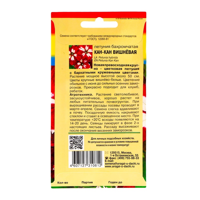 Производитель: УРОЖАЙ УДАЧИ; Габариты: 15 x 8 x 0,3; Страна: Россия; В боксе: 100 шт; Состав: См. на упаковке; Материалы: см. на упаковке; Фасовка: по 1 шт; Индивидуальная упаковка: Без упаковки; Сертификат: Не подлежит сертификации; Цвет: Белый, Красный; Агрономический срок годности, лет: 4; Вегетация: Однолетники; Вид: Петуния; Особенности выращивания: Открытый грунт; Сухоцвет: Нет; Махровые: Нет; По форме куста: Кустовая; Назначение: Для балкона, веранды, Для создания цветников, клумбы; Отношение к свету: Светолюбивые; Разновидность: Цветущее; Нуждаются ли в стратификации: Нет Новая Превосходная Крупноцветковая Петуния Эта петуния с бархатными кружевными цветами представляет собой мощное растение высотой около 50 см. Цветы крупные, вишнёво-белые. Цветение обильное с июня до сильных осенних заморозков. Прекрасно подходит для клумб и рабаток. Aгротехника: Растение светолюбивое, засухоустойчивое, хорошо растет на любых питательных почвогрунтах. Посев семян на рассаду проводят в феврале-марте. Семена слегка вдавливают в почву, землей не присыпают. Условия ухода: Посадочную емкость накрывают стеклом и ставят в освещенное место. При температуре почвы +18-20°C всходы появляются на 14-20 день. Пикировка: Сеянцы пикируют в фазе 2-х настоящих листьев. Высадка в открытый грунт: Рассаду высаживают в открытый грунт после окончания весенних заморозков.