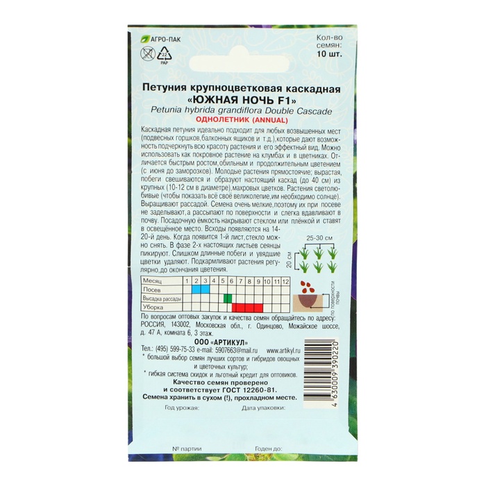Производитель: Артикул; Габариты: 15 x 8 x 0,3; Страна: Россия; В боксе: 300 шт; Состав: Семена; Материалы: семена; Фасовка: по 10 шт; Индивидуальная упаковка: Без упаковки; Габариты товара: 8 см × 0,3 см × 15 см; Сертификат: Не подлежит сертификации; Цвет: Фиолетовый; Высота, см: 40; Вегетация: Однолетники; Вид: Петуния; Посев на рассаду: Март, Февраль; Посев (посадка) в грунт: Май, Июнь; Цветение период: Сентябрь, Июль, Июнь, Август; Упаковка: Цветная; Место выращивания: Открытый грунт; Сухоцвет: Нет; Махровые: Нет; Высота растений: 30-60 см; По форме куста: Кустовая; Назначение: Для создания цветников, клумбы, Для балкона, веранды; Отношение к свету: Светолюбивые; Разновидность: Цветущее; Нуждаются ли в стратификации: Нет; Фиксированная цена: Да