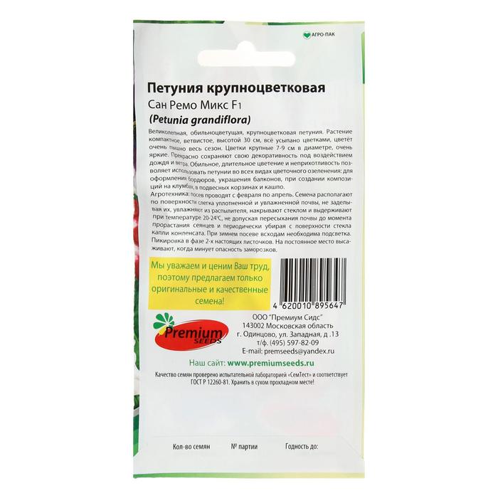Производитель: Premium seeds; Габариты: 15 x 8 x 0,1; Страна: Россия; В боксе: 900 шт; Состав: Семена; Материалы: семена; Фасовка: по 10 шт; Индивидуальная упаковка: Без упаковки; Сертификат: Не подлежит сертификации; Цвет: МИКС; Агрономический срок годности, лет: 3; Вегетация: Однолетники; Вид: Петуния; Особенности выращивания: Открытый грунт; Сухоцвет: Нет; Махровые: Нет; По форме куста: Кустовая; Назначение: Для балкона, веранды, Для создания цветников, клумбы; Отношение к свету: Светолюбивые; Разновидность: Цветущее; Нуждаются ли в стратификации: Нет; Фиксированная цена: Да