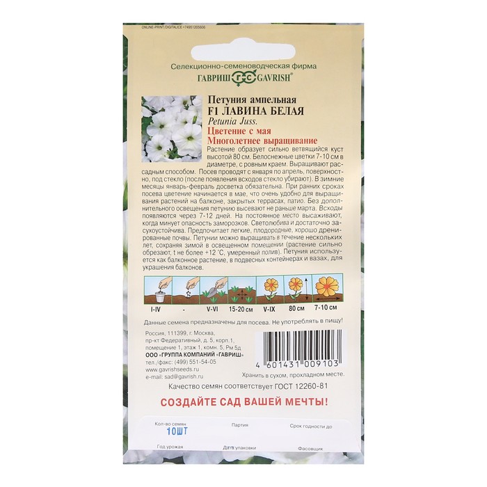 Производитель: Гавриш; Габариты: 15 x 8 x 0,3; Страна: Россия; В боксе: 200 шт; Состав: См. на упаковке; Материалы: см. на упаковке; Фасовка: по 10 шт; Индивидуальная упаковка: Без упаковки; Сертификат: Не подлежит сертификации; Цвет: Белый; Высота, см: 80; Агрономический срок годности, лет: 3; Вегетация: Однолетники; Вид: Петуния; Цветение период: Июнь, Сентябрь, Май, Июль, Август, Апрель; Упаковка: Цветная; Особенности выращивания: Универсальный; Сухоцвет: Нет; Махровые: Нет; По форме куста: Кустовая; Назначение: Для создания цветников, клумбы, Для балкона, веранды; Отношение к свету: Светолюбивые; Разновидность: Цветущее; Нуждаются ли в стратификации: Нет