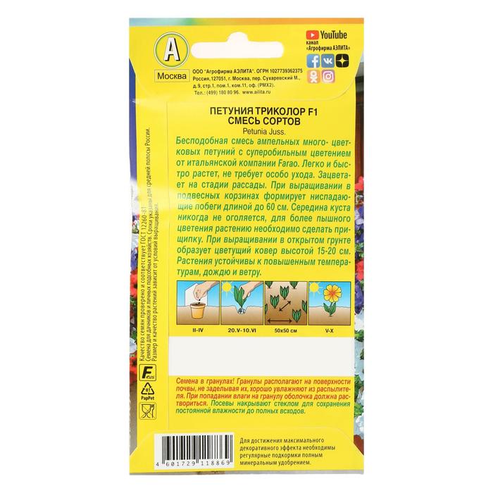 Производитель: Агрофирма АЭЛИТА; Габариты: 15 x 8 x 0,3; Страна: Россия; В боксе: 400 шт; Состав: См. на упаковке; Материалы: см. на упаковке; Фасовка: по 3 шт; Индивидуальная упаковка: Без упаковки; Сертификат: Не подлежит сертификации; Цвет: МИКС; Агрономический срок годности, лет: 3; Вегетация: Однолетники; Вид: Петуния; Особенности выращивания: Открытый грунт; Сухоцвет: Нет; Махровые: Нет; По форме куста: Кустовая; Назначение: Для балкона, веранды, Для создания цветников, клумбы; Отношение к свету: Светолюбивые; Разновидность: Цветущее; Нуждаются ли в стратификации: Нет Бесподобная смесь ампельных петуний с суперобильным цветением. Легко и быстро растет, не требует особого ухода. Зацветает на стадии рассады. При выращивании в подвесных корзинах формирует ниспадающие побеги длиной до 60 см. Середина куста никогда не оголяется. При выращивании в открытом грунте образует цветущий ковер высотой 15-20 см. Растения устойчивы к повышенным температурам, дождю и ветру.