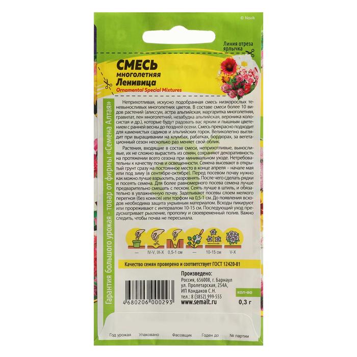 Производитель: Семена Алтая; Габариты: 15 x 8 x 0,1; Страна: Россия; В боксе: 800 шт; Состав: См. на упаковке; Материалы: см. на упаковке; Фасовка: по 10 шт; Индивидуальная упаковка: Без упаковки; Сертификат: Не подлежит сертификации; Цвет: МИКС; Агрономический срок годности, лет: 5; Вегетация: Многолетники; Вид: Прочие; Посев на рассаду: Март, Апрель, Февраль; Посев в грунт: Май; Цветение период: Июль, Июнь, Сентябрь, Август; Особенности выращивания: Открытый грунт; Сухоцвет: Нет; Махровые: Нет; По форме куста: Кустовая; Назначение: Для создания цветников, клумбы; Отношение к свету: Светолюбивые; Разновидность: Цветущее; Нуждаются ли в стратификации: Нет; Фиксированная цена: Да