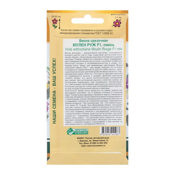 Производитель: Евросемена; Габариты: 15 x 8 x 0,2; Страна: Россия; В боксе: 200 шт; Состав: См. на упаковке; Материалы: см. на упаковке; Фасовка: по 1 шт; Индивидуальная упаковка: Без упаковки; Сертификат: Не подлежит сертификации; Цвет: МИКС; Агрономический срок годности, лет: 5; Вегетация: Однолетники; Вид: Виола; Особенности выращивания: Открытый грунт; Сухоцвет: Нет; Махровые: Нет; По форме куста: Кустовая; Назначение: Для создания цветников, клумбы; Отношение к свету: Рассеянный свет; Разновидность: Цветущее; Нуждаются ли в стратификации: Нет