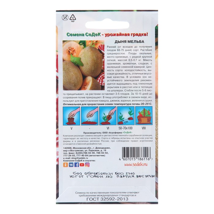 Ранний (от всходов до получения плодов 68-75 дней) сорт. Растение среднерослое. Плоды овальные, желто-кремовые, с редкой крупной сеткой, массой 0,5-0,7 кг. Мякоть оранжевая, ароматная, сладкая, с маленькой семенной камерой. Ценность сорта: холодостойкость, высокая урожайность, отличные вкусовые качества. В условиях зон неустойчивого земледелия рекомендуется выращивать под пленочным укрытием в расстил или в теплицах на шпалерах. Стебли после 5-6 листа прищипывают, на растении оставляют 3-5 плодов. За 10-15 дней до созревания поливы прекращают. В пищу употребляют в свежем виде, используют для приготовления повидла, джемов, варенья, вяления и сушки.