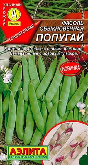 Семена Фасоль Попугай. Среднеспелый сорт фасоли для получения урожая зерна. Растения кустовые, крепкие, раскидистой формы. Могут выращиваться без использования опоры благодаря плотному габитусу. Высота куста не превышает 40 см. Цветки белые. Бобы плоские, короткие (9-12 см.), широкие. Каждый содержит 4-6 семян. Зерно крупное, красивое, белое с объемным розовым глазком. Созревание наступает через 72-77 дней после появления всходов. Продукция отличных вкусовых качеств, широко используется в кулинарии, подходит для консервирования.