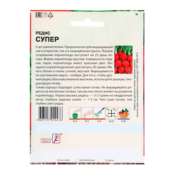 Производитель: Сембат; Габариты: 15,5 x 11,5 x 0,3; Страна: Россия; В боксе: 30 шт; Состав: Семена; Материалы: семена; Фасовка: по 10 шт; Индивидуальная упаковка: Без упаковки; Сертификат: Не подлежит сертификации; Агрономический срок годности, лет: 4; Сроки созревания: Ранний; Посев в грунт: Май, Июнь, Июль, Апрель, Август, Сентябрь; Особенности выращивания: Открытый грунт; Сорт или гибрид: Сорт; Цвет плода: Розовый; Вид: Семечки; Форма: Круглая; С белым кончиком: Нет