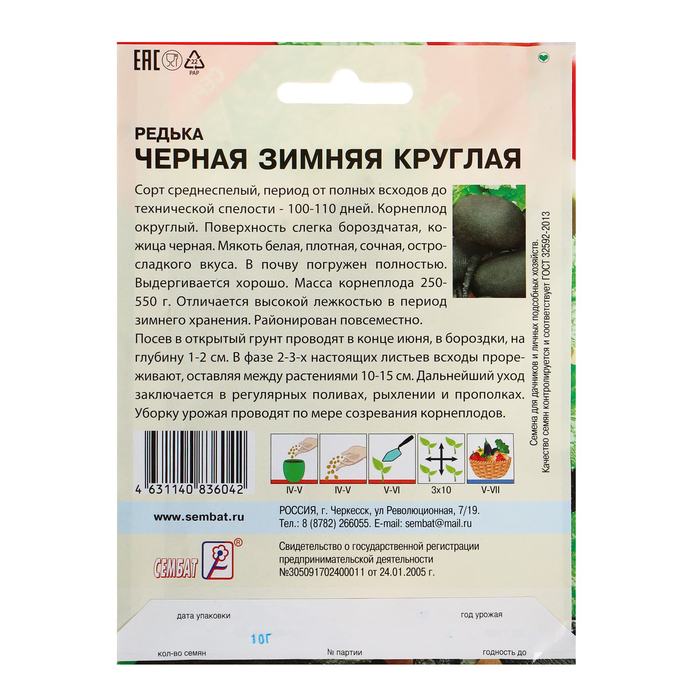 Производитель: Сембат; Габариты: 11,5 x 15,5 x 0,2; Страна: Россия; В боксе: 300 шт; Состав: Семена; Материалы: семена; Фасовка: по 10 шт; Индивидуальная упаковка: Без упаковки; Сертификат: Не подлежит сертификации; Агрономический срок годности, лет: 4; Сроки созревания: Средний; Посев в грунт: Май, Апрель; Упаковка: Цветная; Особенности выращивания: Открытый грунт; Сорт или гибрид: Сорт; Вегетационный период, дни: 100; Цвет плода: Чёрный; Вид: Простые семена; Форма: Круглая