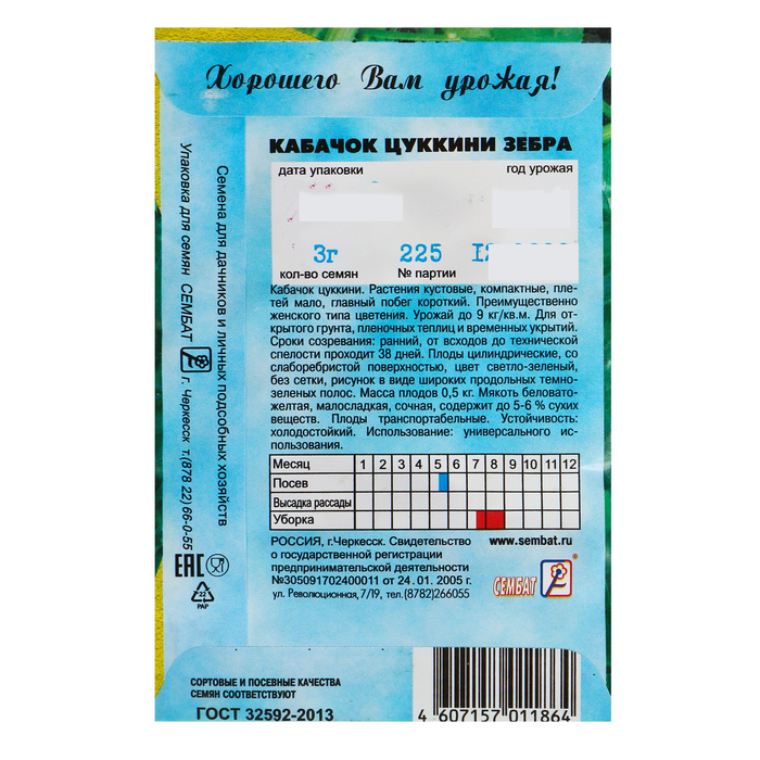 Производитель: Сембат; Габариты: 7,5 x 11,5 x 0,2; Страна: Россия; В боксе: 1100 шт; Состав: Семена; Материалы: семена; Фасовка: по 10 шт; Индивидуальная упаковка: Без упаковки; Сертификат: Не подлежит сертификации; Агрономический срок годности, лет: 7; Сроки созревания: Ранний; Особенности выращивания: Закрытый грунт (теплицы, укрытия); Сорт или гибрид: Сорт; Цвет плода: Зелёный; Форма: Цилиндрическая