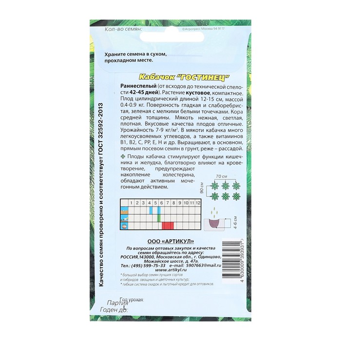 Производитель: Артикул; Габариты: 5 x 8 x 0,2; Страна: Россия; Состав: См. на упаковке; Материалы: см. на упаковке; Фасовка: по 1 шт; Сертификат: Не подлежит сертификации; Агрономический срок годности, лет: 7; Сроки созревания: Ранний; Особенности выращивания: Открытый грунт; Сорт или гибрид: Сорт; Цвет плода: Зелёный; Форма: Цилиндрическая