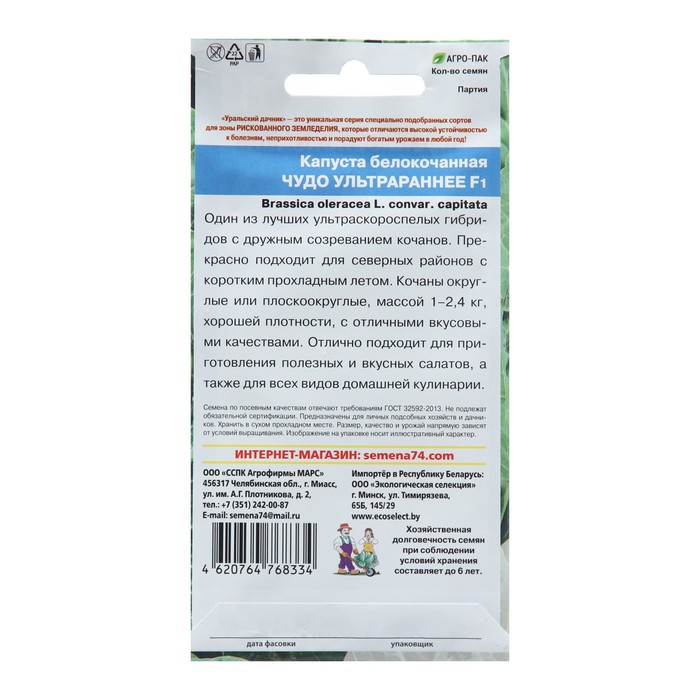 Производитель: Уральский Дачник; Габариты: 15 x 8 x 0,2; Страна: Россия; В боксе: 600 шт; Состав: Семена; Материалы: семена; Фасовка: по 10 шт; Индивидуальная упаковка: Без упаковки; Сертификат: Не подлежит сертификации; Агрономический срок годности, лет: 5; Сроки созревания: Сверхранний (скороспелый); Посев на рассаду: Март, Апрель; Посев в грунт: Май, Июнь; Упаковка: Цветная; Особенности выращивания: Открытый грунт; Сорт или гибрид: Гибрид F1; Вид капусты: Белокачанная; Вид: Горошины; Применение: Универсальное Один из лучших paннеспелых гибридов c дружным созреванием кочанов. кочаны округлые или плоско - округлые, массой 1-2,4 кг, хорошей плотности, с отличными вкусовыми качествами. отлично подходит для приготовления полезных и вкусных салатов, а также для всех видов домашней кулинарии.