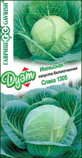 Капуста белокочанная Слава 1305: Среднеспелый (до 126 дней от всходов до технической спелости) сорт. Выращивают рассадным способом. Кочан округлый, массой 2,4–4,5 кг., хорошей плотности, темно-зеленый, с восковым налетом. Сорт характеризуется хорошей лежкостью и стабильной урожайностью. Вкусовые качества отличные. Рекомендован для квашения, а также для употребления в свежем виде в осенне-зимний период. Урожайность до 10,0кг/м2. Посев на рассаду в середине марта —начале апреля. Пикировка — в фазе семядолей. Высадка рассады в грунт в середине — конце мая по схеме 60х40 см.