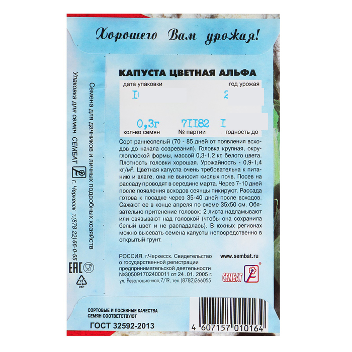 Производитель: Сембат; Габариты: 7,5 x 11,5 x 0,1; Страна: Россия; В боксе: 1400 шт; Состав: Семена; Материалы: семена; Фасовка: по 10 шт; Индивидуальная упаковка: Без упаковки; Сертификат: Не подлежит сертификации; Агрономический срок годности, лет: 5; Сроки созревания: Ранний; Посев на рассаду: Апрель, Март; Посев в грунт: Июнь, Май; Упаковка: Цветная; Особенности выращивания: Открытый грунт; Сорт или гибрид: Сорт; Вид капусты: Цветная; Вид: Горошины; Применение: Универсальное