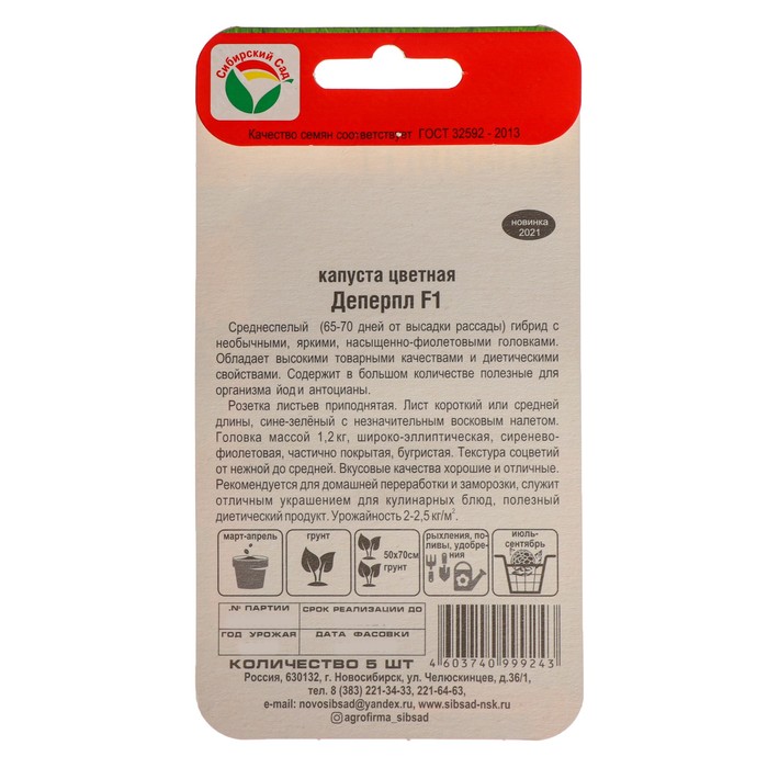 Производитель: Сибирский сад; Габариты: 14 x 7 x 0,2; Страна: Россия; В боксе: 100 шт; Состав: Семена; Материалы: семена; Фасовка: по 3 шт; Индивидуальная упаковка: Без упаковки; Сертификат: Не подлежит сертификации; Агрономический срок годности, лет: 5; Сроки созревания: Средний; Посев на рассаду: Март, Апрель; Посев в грунт: Май, Июнь; Упаковка: Цветная; Особенности выращивания: Открытый грунт; Сорт или гибрид: Гибрид F1; Вид капусты: Цветная; Вид: Горошины; Применение: Универсальное