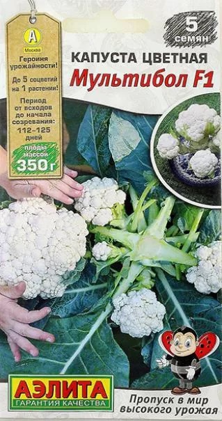Семена Капуста цв. Мультибол F1. Уникальный новый гибрид! Бонус от «матери-природы» – 5 соцветий на одном растении! Высота растения 30-40 см. Период от посева до технической спелости центрального соцветия составляет 112-125 дней. Боковые соцветия формируются в течение 3-4 недель после срезки основного. Масса каждого соцветия – 300-350 г. Урожайность гибрида – до 2 кг. с одного растения. Соцветия очень плотные, по вкусу сладковатые, нежные. Белоснежные головки рекомендуется использовать для диетического питания: в свежем виде (без термической обработки) в салатах, для запекания, тушения, маринования. Гибрид не содержит ГМО.