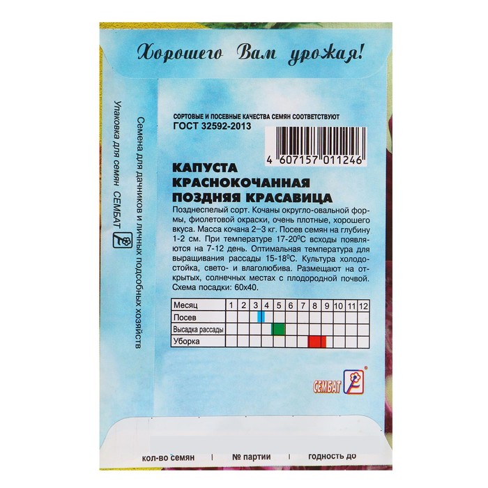 Производитель: Сембат; Габариты: 7,5 x 11,5 x 0,1; Страна: Россия; В боксе: 600 шт; Состав: Семена; Материалы: семена; Фасовка: по 10 шт; Индивидуальная упаковка: Без упаковки; Сертификат: Не подлежит сертификации; Агрономический срок годности, лет: 5; Сроки созревания: Поздний; Упаковка: Цветная; Особенности выращивания: Открытый грунт; Сорт или гибрид: Сорт; Вегетационный период, дни: 90 - 120; Вид капусты: Краснокачанная