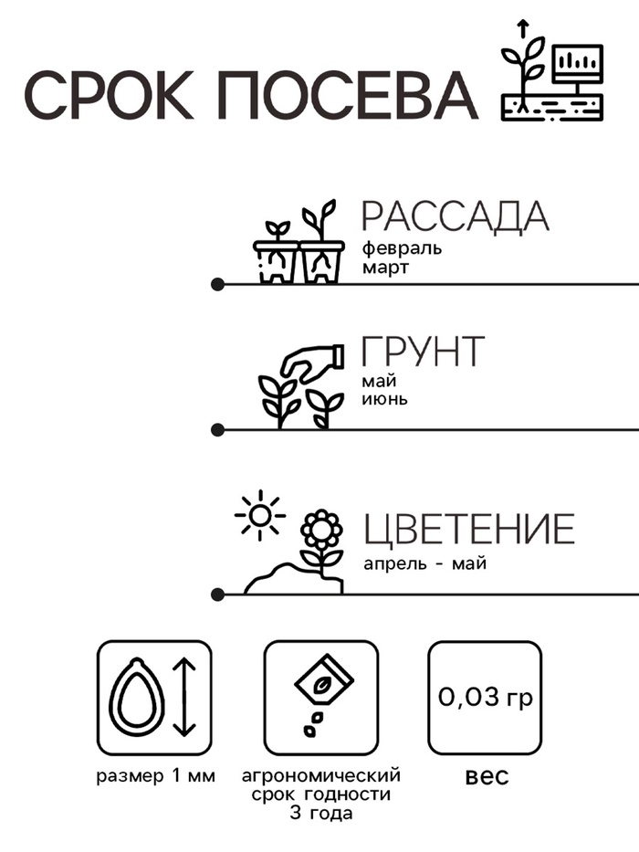 Производитель: Семена Алтая; Габариты: 15 x 8 x 0,3; Страна: Россия; В боксе: 900 шт; Состав: См. на упаковке; Материалы: см. на упаковке; Фасовка: по 10 шт; Индивидуальная упаковка: Без упаковки; Сертификат: Не подлежит сертификации; Цвет: МИКС; Высота, см: 50; Вегетация: Многолетники; Вид: Прочие; Тип: Комнатные; Место выращивания: Открытый грунт; Подходит для балкона: Да; Махровые: Нет; Высота растений: 30-60 см; По форме куста: Кустовая; Отношение к свету: Рассеянный свет