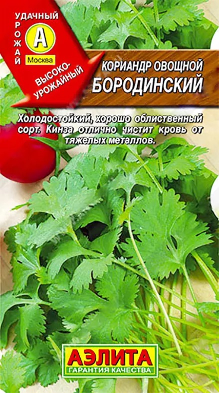 Среднеспелый сорт, предназначенный для использования зелени в свежем виде в салатах, гарнирах, соусах и приготовления пряных приправ из семян. От полных всходов до уборки на зелень (начало фазы стеблевания) – 35-45 дней, до созревания семян – 80-90 дней. Растения холодостойкие, компактные, с хорошей облиственностью, высотой 70-75 см. Масса одного растения при уборке на зелень составляет 25-30 г. Зеленая масса обладает приятным нежным вкусом и характерным ароматом, содержит большое количество каротина, витаминов С, Р и группы В. Урожайность – 2,5 кг/м2.