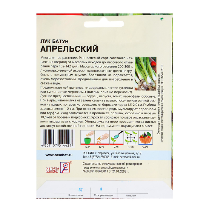 Производитель: Сембат; Габариты: 11,5 x 7,5 x 0,1; Страна: Россия; В боксе: 1200 шт; Состав: Семена; Материалы: семена; Фасовка: по 10 шт; Индивидуальная упаковка: Без упаковки; Сертификат: Не подлежит сертификации; Агрономический срок годности, лет: 3; Сроки созревания: Средний; Особенности выращивания: Открытый грунт; Сорт или гибрид: Сорт; Вид лука: Батун
