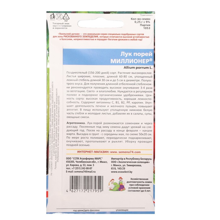 Производитель: Уральский Дачник; Габариты: 15 x 8 x 0,1; Страна: Россия; В боксе: 200 шт; Состав: Семена; Материалы: семена; Фасовка: по 9 шт; Индивидуальная упаковка: Без упаковки; Сертификат: Не подлежит сертификации; Агрономический срок годности, лет: 3; Сроки созревания: Поздний; Особенности выращивания: Открытый грунт; Сорт или гибрид: Сорт; Вид лука: Порей «Уральский дачник» — это уникальная серия специально подобранных сортов для зоны РИСКОВАННОГО ЗЕМЛЕДЕЛИЯ, которые отличаются высокой устойчивостью. к болезням, неприхотливостью и порадуют богатым урожаем в любой год! Позднеспелый (156-200 дней) сорт. Растение высокорослое. Листья широкие, плоские, длиной 60-80 см, утолщенный ложный стебель длиной 30 см и до 5 см в диаметре. Полуострого вкуса. Для получения длинной отбеленной стебленожки рекомендуется проводить высокое окучивание 3-4 раза за вегетацию. Свето- и влаголюбив. Нуждается в регулярном поливе и подкормке органическими удобрениями.