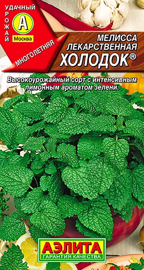 Семена Мелисса лекарственная Холодок. Ароматный травянистый многолетник. На одном месте выращивают 3-5 лет. Раннеспелый, от всходов до начала цветения 70-80 дней. От весеннего отрастания на второй год до начала уборки около 50 дней. Растения сильно кустятся и формируют высокий урожай зеленой массы – 2,5-3 кг/м 2 . Высота кустов 45-55 см, Ø 35-45 см. Аромат лимонный, освежающий, высокой интенсивности. Сорт устойчив к болезням и вредителям. Пригоден для выращивания в контейнерной культуре на балконе.