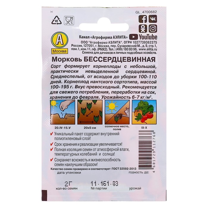 Производитель: Агрофирма АЭЛИТА; Габариты: 15 x 8 x 0,2; Страна: Россия; В боксе: 1500 шт; Состав: См. на упаковке; Материалы: см. на упаковке; Фасовка: по 10 шт; Сертификат: Не подлежит сертификации; Сроки созревания: Средний; Посев (посадка) в грунт: Апрель; Упаковка: Цветная; Место выращивания: Открытый грунт; Сорт или гибрид: Сорт; Вегетационный период, дни: 105; Ампельные: Нет; Вьющиеся (лианы): Нет; Цвет плода: Оранжевый; Вид: Простые семена