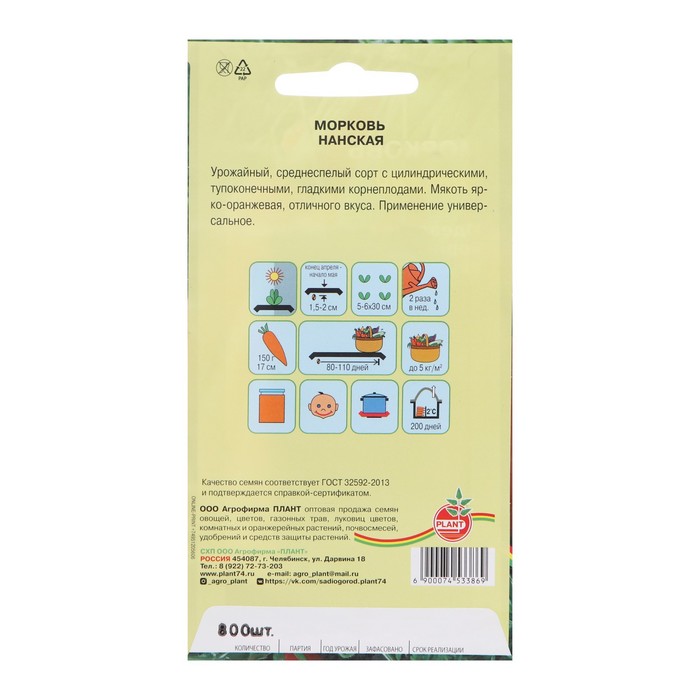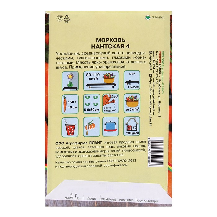 Производитель: Plant; Габариты: 15 x 8 x 0,3; Страна: Россия; В боксе: 500 шт; Состав: См. на упаковке; Материалы: см. на упаковке; Фасовка: по 20 шт; Индивидуальная упаковка: Без упаковки; Сертификат: Не подлежит сертификации; Агрономический срок годности, лет: 3; Сроки созревания: Средний; Особенности выращивания: Открытый грунт; Сорт или гибрид: Сорт