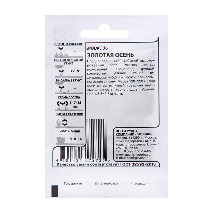 Производитель: Гавриш; Габариты: 11,5 x 7,5 x 0,3; Страна: Россия; В боксе: 500 шт; Состав: Семена; Материалы: семена; Фасовка: по 10 шт; Индивидуальная упаковка: Без упаковки; Сертификат: Не подлежит сертификации; Агрономический срок годности, лет: 3; Сроки созревания: Средний; Посев в грунт: Апрель; Упаковка: Белая; Особенности выращивания: Открытый грунт; Сорт или гибрид: Сорт; Сорт: Золотая осень; Ампельные: Нет; Вьющиеся (лианы): Нет; Цвет плода: Оранжевый; Вид: Простые семена