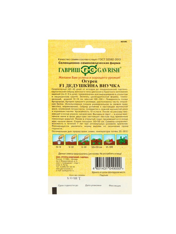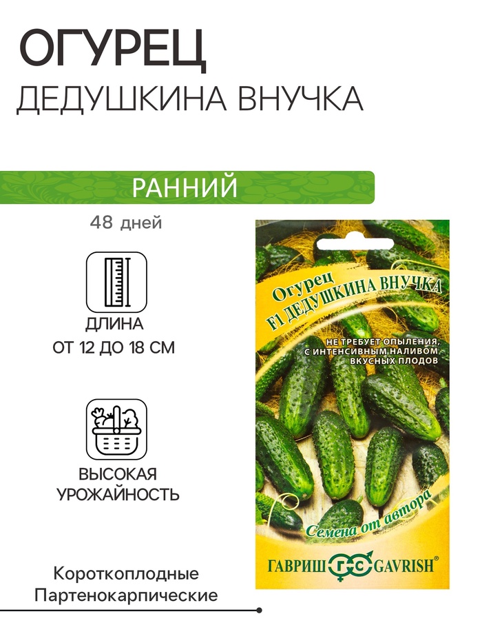 Производитель: Гавриш; Габариты: 15 x 8 x 0,2; Страна: Россия; В боксе: 200 шт; Состав: См. на упаковке; Материалы: см. на упаковке; Фасовка: по 10 шт; Индивидуальная упаковка: Без упаковки; Сертификат: Не подлежит сертификации; Тип: Партенокарпические; Сроки созревания: Ранний; Посев на рассаду: Апрель, Май; Посев (посадка) в грунт: Июнь, Май; Упаковка: Цветная; Место выращивания: Универсальный; Сорт или гибрид: Гибрид F1; Сорт: F1; Ампельные: Да; Вьющиеся (лианы): Да; Урожайность, кг с куста: 12; Сроки созревания: Ранний ( до 48 дней); Размер: Короткоплодные (от 12 до 18 см); Форма: Цилиндрическая; Применение: Универсальное; Урожайность, м²: 12; Тип поверхности: Среднебугорчатый