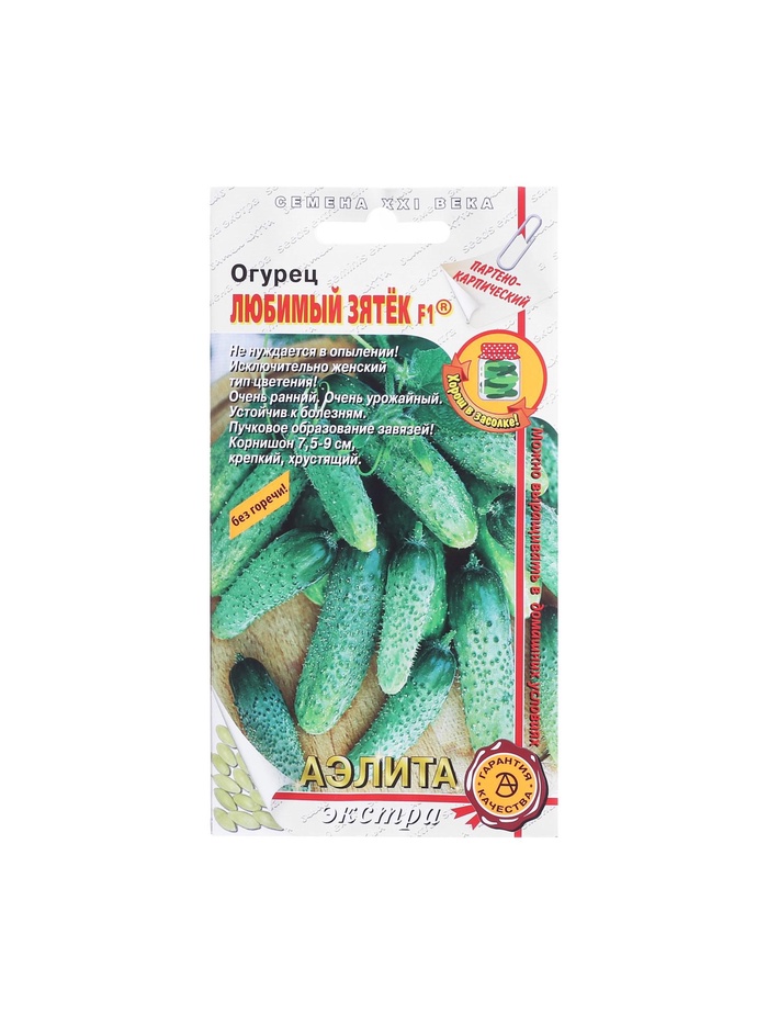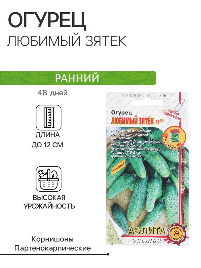 «Любимый зятёк» — это новый раннеспелый партенокарпический сорт для открытого грунта, плёночных укрытий и стеклянных теплиц. Плодоношение начинается на 41–43-й день от всходов.