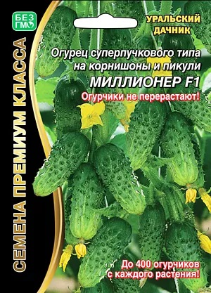 Огурец суперпучкового типа на корнишоны и пикули . Это редкая удача селекционера. Действительно, чтобы в одном и том же гибриде сочетались раннеспелость, великолепный вкус, огромная урожайность, отличный внешний вид плодов, могучий красивый куст, — такое встретишь нечасто. Очень урожайный суперпучковый гибрид женского типа цветения для выращивания в открытом грунте, весенних теплицах, тоннелях. Ветвление ограничено. Зеленцы корнишонного типа, крупнобугорчатые, белошипые, длиной 8-12 см, очень высоких засолочных качеств.