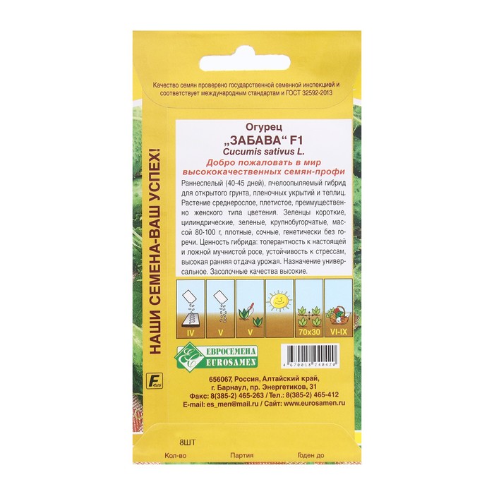 Производитель: Евросемена; Габариты: 15 x 8 x 0,2; Страна: Россия; В боксе: 100 шт; Состав: См. на упаковке; Материалы: см. на упаковке; Фасовка: по 10 шт; Индивидуальная упаковка: Без упаковки; Сертификат: Не подлежит сертификации; Агрономический срок годности, лет: 7; Вид: Пчёлоопыляемый; Сроки созревания: Ранний; Особенности выращивания: Открытый грунт; Сорт или гибрид: Гибрид F1; Сорт: F1; Ампельные: Да; Вьющиеся (лианы): Да; Сроки созревания: Ранний ( до 48 дней); Размер: Короткоплодные (от 12 до 18 см); Гладкие: Нет; Бугорчатые: Да