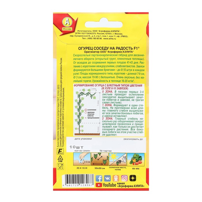 Производитель: Агрофирма АЭЛИТА; Габариты: 15 x 8 x 0,1; Страна: Россия; В боксе: 200 шт; Состав: См. на упаковке; Материалы: см. на упаковке; Фасовка: по 1 шт; Индивидуальная упаковка: Без упаковки; Сертификат: Не подлежит сертификации; Агрономический срок годности, лет: 7; Вид: Партенокарпические; Сроки созревания: Ранний; Особенности выращивания: Универсальный; Сорт или гибрид: Гибрид F1; Сорт: F1; Ампельные: Да; Вьющиеся (лианы): Да; Сроки созревания: Ранний ( до 48 дней); Размер: Корнишоны (до 12 см); Гладкие: Нет; Бугорчатые: Да Скороспелый партенокарпический гибрид для весенне-летнего оборота (открытый грунт, пленочные теплицы). От всходов до технической спелости первых плодов 41-43 дня. Растение индетерминантное, с короткими междоузлиями, слабоветвистое. Завязи формируются большими букетами до 8-10 штук! Плоды корнишонного типа, короткие - длиной 7-9 см, диаметром 3 см, массой 70-90 г, белошипые. Очень вкусные, без малейшей горечи. Урожайность 6-8 кг с растения.