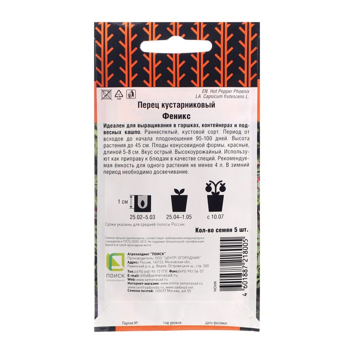 Производитель: ПОИСК; Габариты: 15 x 8 x 0,2; Страна: Россия; В боксе: 400 шт; Состав: Семена; Материалы: семена; Фасовка: по 3 шт; Индивидуальная упаковка: Без упаковки; Сертификат: Не подлежит сертификации; Цвет: Красный; Агрономический срок годности, лет: 3; Сроки созревания: Ранний; Вкус: Острый; Особенности выращивания: Закрытый грунт (теплицы, укрытия); Сорт или гибрид: Сорт; Толстостенный тип: Да; Высота: Среднерослый